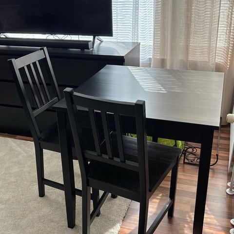 Myydään käytetty ruokailuryhmä käytöstä. Ruokapöytä on jatkettavaa mallia, suomalainen tuote. Ollut käytössä 4 hengen ruokaryhmänä. Koko noin 80*140+jatko-osa keskelle. Puhdistettu ja pöydän pinnassa ainoastaan kuvassa näkyvät kulumat ja pieniä iskeymiä. Voi hyvin esim.vahakankaan laittaen tai kaitaliinalla peittää. Tuoleja mukaan 6 kappaletta, nämä puisia Askon tuoleja. Yhdestä tuolista yhdeltä sivulta tukipinna irronnut, mutta voinut istua silti. Väri kerman valkoinen.