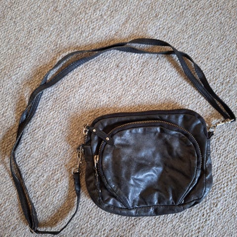 Filippa K:n kirjekuorilaukku, mokkanahkaa, irroitettava hihna.