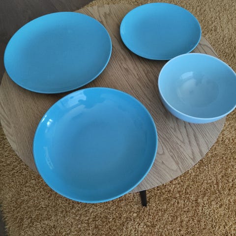 Myydään setti sinisiä astioita yhteishintaan 2 euroa. Mukana on ruokalautanen (27 cm), pienempi lautanen (21 cm), pastalautanen (24,5 cm) sekä kaksi murokulhoa (16 cm). Merkitsin astiaston kunnon kohtalaiseksi siinä näkyvien käytön jälkien takia.