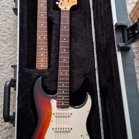 Katu-uskottava Moss green over sunburst relic strato. Kaula ainakin joku vanhempi (matsumoku?) body ei mikään maailman laadukkain mutta erittäin hyvä sustain tässä kokonaisuudessa. Fenderin waterslidet. Tämä on yksi iät ja ajat vanhoja relikointi projekteja, mikä laitettu nippuun ja soivaksi peliksi, niin ei ole hirveitä lakkoja tms. viimeistelyjä. Hyvät nauhat ja suora kaula.