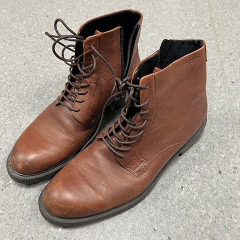 Vagabond nahkakengät, koko 41. Mustat nauhalliset kengät, sileää nahkaa ja paksu kumipohja. Sopivat arkikäyttöön ja siistimpään pukeutumiseen. Klassinen malli, pyöristetty kärki ja matala korko.