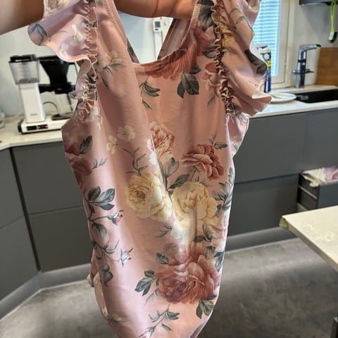 Kaunis pinkki väri valkoisilla pilkuilla. Säädettävät olkaimet, istuu hyvin. Miellyttävä ja joustava materiaali.