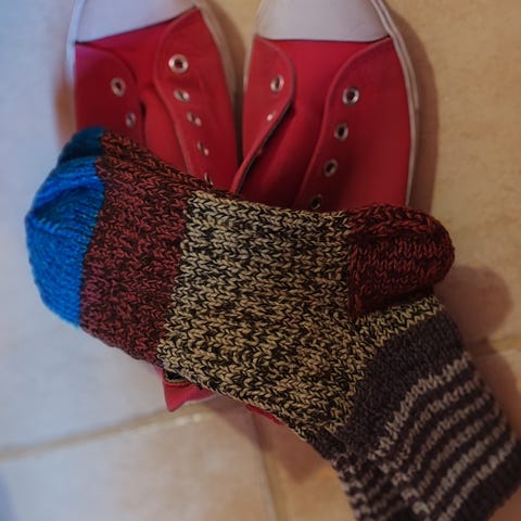 Myydään käsin neulotut tossut, koko 33 Lämpimät ja kestävät, lankana 7 Veljestä (Novita) – 75 % villaa ja 25 % polyamidia. Myynnissä myös muualla.