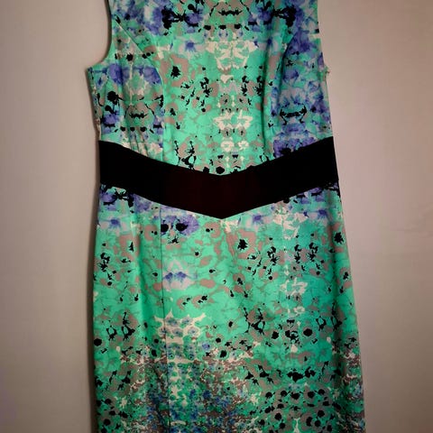 Naisten kesämekko, koko M. Materiaalina puuvilla. Mekossa on monivärinen, kirjava kuosi turkoosilla pohjalla. Malli on hihaton, olkaimellinen ja helmasta leveästi laskeutuva. Sopii käytettäväksi arjessa ja vapaa-ajalla lämpimällä säällä.
