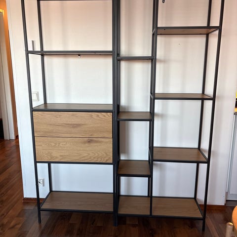 Helppo kasata, purkaa ja kuljettaa. Hyllyjen paikkaa voi vaihdella. Hyllyjä yhteensä 16. Hyllyn leveys 67cm. Haku Kuokkalasta.