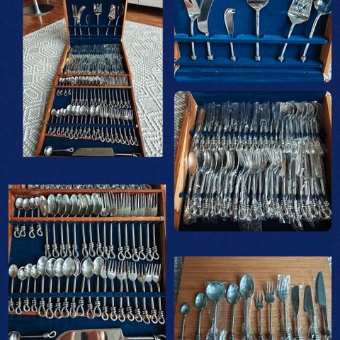Ranskalaiset pihviaterimet sekä jälkiruokalusikat. 6kpl kaikkia puisissa koteloissa.