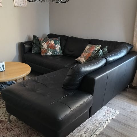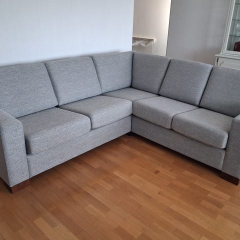 Aikanaan Sotkasta ostettu suuri kulmasohva. Ollut erittäin vähällä käytöllä, joten lähes uudenveroinen. Pesty tekstiilipesurilla käytön aikana, ja voidaan halutessa pestä myös ennen hakua. Istuin- ja selkätyynyjen päälliset saa vetskarilla irti.