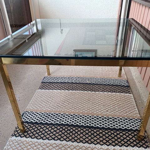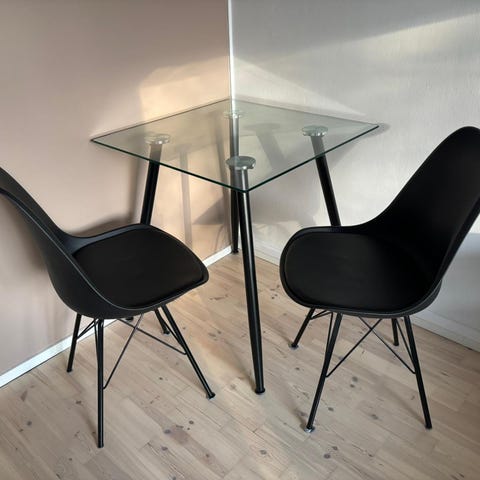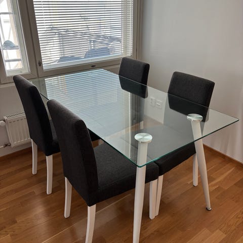 Lasipöytä + 4 tuolia. Pöydän voi avata laajemmaksi.