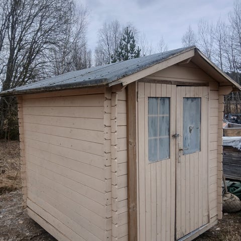 Puinen kevythirsi pihavarasto joka iältään maksimissaan viisi vuotta vanha. Koko noin 2x2 m mutta tarvittaessa voin mitata tarkat sisä-/ulkomitat. Ulkovuoraus on tummaksi käsiteltyä mäntyä ja ikkunalliset ovet sekä räystäslaudat ovat valkoiset. Kattomateriaalina palahuopa asiallisilla peltilistoilla. Rakennus soveltuu esimerkiksi puutarhavälineiden, polttopuiden, muun pihakaluston säilytykseen tai miksei myös leikkimökiksi. Sisällä on harmaaksi käsitelty lautalattia ja rakennus on rakennettu betonilaatan päälle joten varmuudella pysynyt alaosasta kuivana. Mökin viereen pääsee hiab-autolla, vain nouto.
