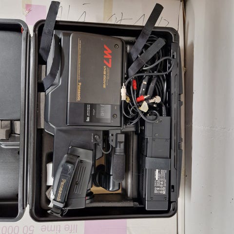 Panasonic videokamera, väri musta. Olkahihna kiinnitetty runkoon. Kamerassa sivulla kasettipesä ja perinteinen etsin. Sopii videokuvaukseen esimerkiksi koti- ja harrastekäyttöön. Paketissa mukana latauslaite, akut (vaatii uusinnan), johdot, kaksi tyhjää kasettia, kameralaukku.