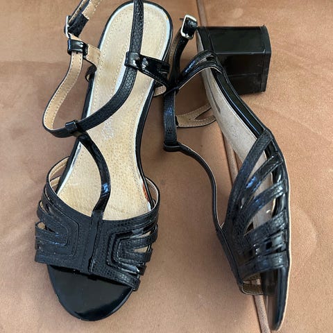 Ulkomailta ostettu ihanat beigerusehtavat kiilakorolliset sandaalit. Menee myös juhlakenkinä.