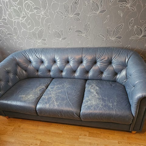 Nahkasohvissa kissan kynsien jälkiä. Pienempi valkoinen vähän paremmassa kunnossa. oma kuljetus saa hakea pois.