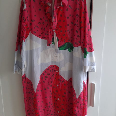 Marimekko naisten kesämekko, koko 42. Mekko on valmistettu 100 % puuvillasta. Kuosina on kirjava, pääosin punasävyinen kuviointi, jossa on erivärisiä paikkamaisia yksityiskohtia. Mallissa on puolipitkät hihat ja etupuolella nappikiinnitys. Sopii käytettäväksi arki- ja kesämekkona.