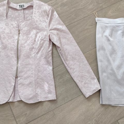 Muutaman kerran käytetty uutta vastaava vaaleanharmaa jakkupuku. Jakun pituus olkapäältä 92cm ja koko 38/40 ja housut koko 40. Täysin ehjät ja hyväkuntoiset. Materiaali polyesteriä.
