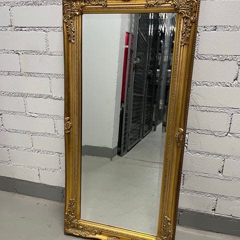 IKEA peili, jossa kapea kultainen kehys. Peili on suorakulmainen ja yläreunasta kaareva. Soveltuu esimerkiksi eteiseen, makuuhuoneeseen tai olohuoneeseen seinälle ripustettavaksi kokovartalopeiliksi. Mitat näkyvät kuvissa mittanauhan avulla arvioitaviksi.