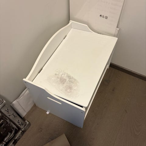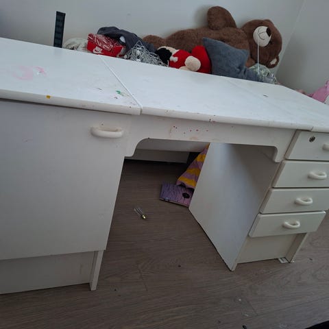 Lasten kirjoituspöytä. Pöydässä on vaalea runko ja vaalea kansi, jossa on kuvioita. Vasemmalla puolella on kaappi ja avohylly, oikealla puolella kolme vetolaatikkoa ja avohylly. Sopii esimerkiksi lasten huoneeseen läksyjen tekoon ja askarteluun. Kannen alla peili.