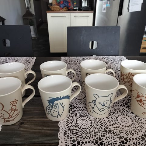 Helinä Tilk tarjoilu lautanen, halkaisija 30 cm, sokerikko, kermakko, 4 keltainen omena- mukia, 3 mansikka- mukia. Vähän käytetty, ei ole pesty astianpesukoneessa.