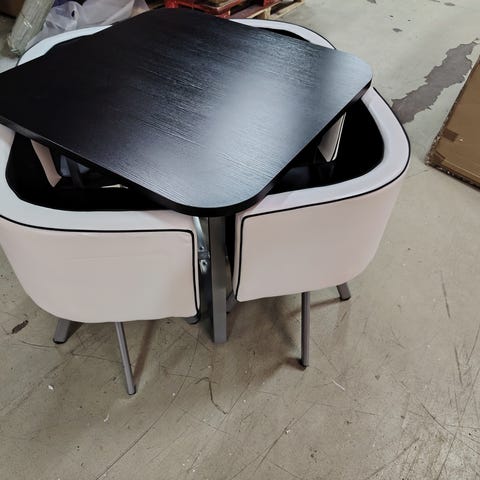 Ruokailuryhmä, 4 tuolia ja yksi pöytä, käyttämätön, ollut esittelykappale showroomissa. Pöydän halkaisija 80 cm.