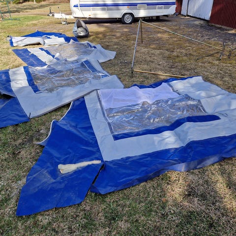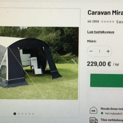 Reimon Villa Caravan 385 etuseinä ja sivuseinät, meillä käytössä on ollut vain sivuseinät. Kiinnitys omilla putkilla, meillä ollut Fiamman pussimarkiisissa. Etuseinää kotipihassa kokeiltu ja sopi myös 4m leveään markiisiin. Palat kiinnittyvät toisiinsa vetoketjulla. Ovi etuseinässä. Alkuperäiset verhot löytyy, niitä ei ole koskaan käytetty. Lisävarusteena hankittu pehmusteet vaunun seinän ja pystyyn kiinnitettävän tangon väliin sekä keskelle markiisia tuleva lisätukitanko ( näiden ovh noin 100€). Mukaan saa alareunojen kumikiinnikkeet ja kasan kiiloja. Ensimmäinen kuva lainattu netistä, sillä meillä ei ole enää vaunua, johon tätä malliksi kiinnittäisi. Sijaitsee Pirkanmaalla, voidaan postittaa tai kulkee mukana, missä milloin reissataankaan.