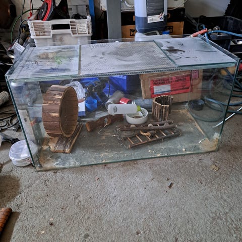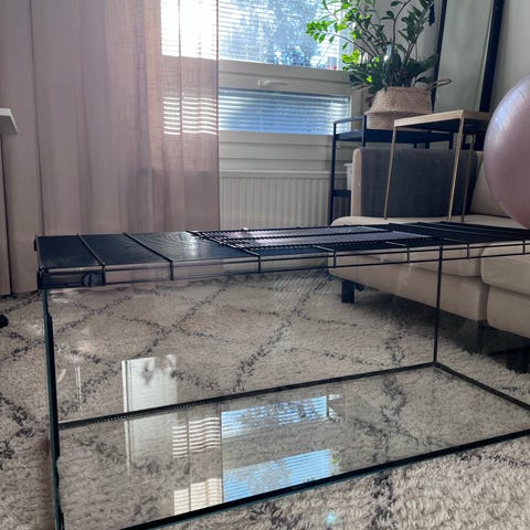 Terraario koko n 75x35cm. Lisätilaa kahdella tasolla. Lasikannet, ei suositella käytettävän molempia kun ei happi kulje. Itse käytin ilman kantta hamsterilla. Tarkempi pesu jää ostajalle