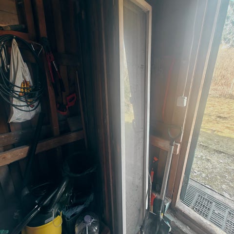 Ikkunat on pakattu muoviin ja sidottu kuljetusta varten. Yhdessä kuvassa näkyy vaurio karmissa. Lasit ehjiä.