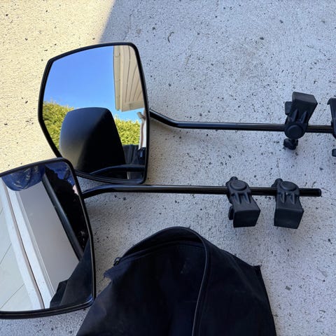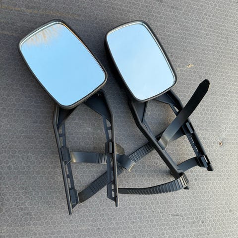Kaksiosainen peili, varsi nivelletty, jolloin säätö monipuolisempaa. Kiinnitys auton sivupeiliin kumisilla remmeillä. Ollut käytössä yhden kesän.