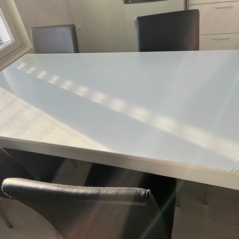 Pöydässä irrotettava lasikansi. Naarmut vain lasissa, itse pöytä ehjä ja hyväkuntoinen.