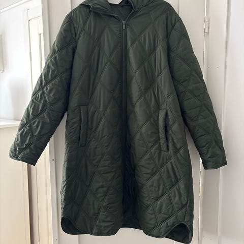 Hupullinen pitkä tikkitakki koko 44. Kaksisuuntainen vetoketju,sivutaskut, irrotettava huppu, hiharesorit. Tuulenpitävä. Lähes käyttämätön.