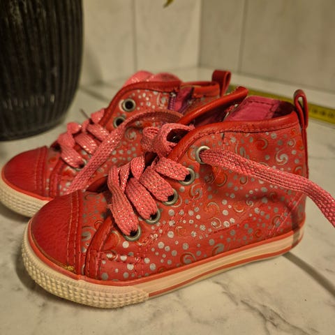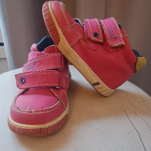 H&M lasten tennarit tytöille, koko 23. Väri vaalea persikka. Kengissä on kaksi tarrakiinnitystä, jotka helpottavat pukemista ja riisumista. Päällinen on kangasta ja pohja kumia. Sopivat arkeen ja leikkeihin kevät- ja kesäkäyttöön. Lämpömuovautuvat pohjalliset. Tytär tykkäsi näistä paljon. Hieman värjäytymää, mutta vielä mielestäni tosi siistit seuraavalle. Sisämitta n.14cm.