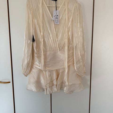 Vila juhla- tai cocktailmekko naisille. Koko S. Mekko on beigensävyinen ja valmistettu polyesteristä.