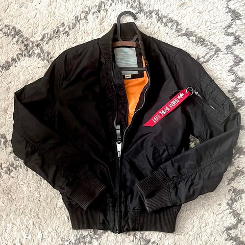 Alpha Industries bomber-takki, koko S. Väri musta ja materiaali polyesteriä. Takissa on vetoketjukiinnitys edessä, neulottu resori helmassa, hihansuissa ja kauluksessa sekä etutaskut nepparikiinnityksellä. Hihassa on vetoketjutasku.