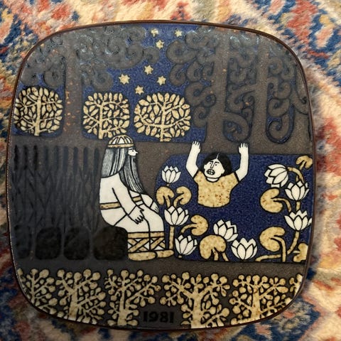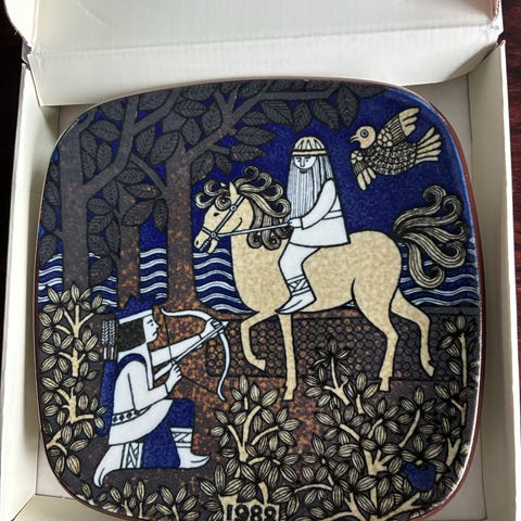 Arabia Kalevala seinälautanen vuodelta 1981. Takapuolella on ripustuslenkki seinälle kiinnittämistä varten sekä valmistajan ja suunnittelijan merkinnät. Sopii keräilyesineeksi tai sisustuksen seinäkoristeeksi.