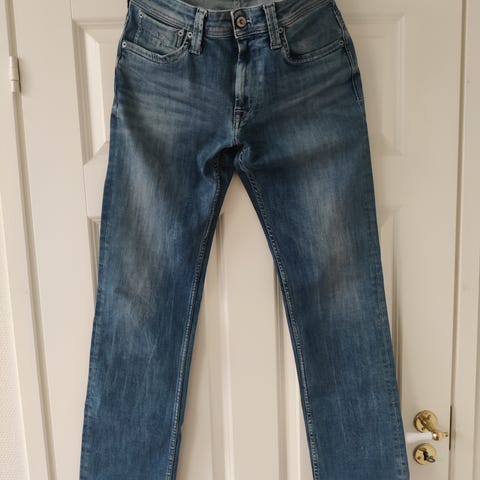 Kaksi kertaa pestyt vähän käytetyt farkut. Materiaali: Puuvilla 98%, Elastaani 2%. Koko 32/34. Nouto Espoosta tai sovittaessa pk-seudulta. Maksu mobilepay tai käteinen noudettaessa.