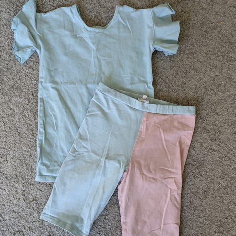 Hyväkuntoiset shortsit 140 (vastaa pienempää) ja toppi 128.