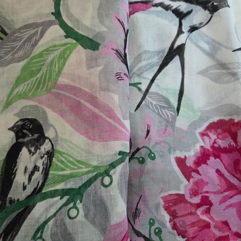 Uudet käyttämättömät verhot. Pohjaväri vaaleanpunainen, kukat violetti-valkoisia. Toisessa kuvassa oikea sävy verhoista. Verhoja 2kpl.