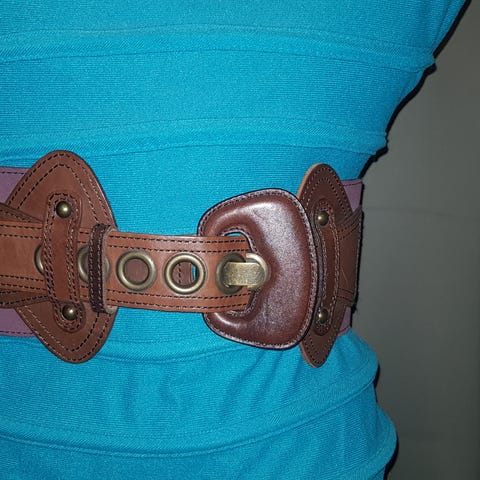 Naisten leveä vyö, jossa koristeellinen rusetti edessä. Vyö on ruskean sävyinen ja suunniteltu käytettäväksi esimerkiksi mekkojen tai tunikoiden kanssa vyötäröä korostavana asusteena. Materiaali vaikuttaa pehmeältä ja taipuvalta. Vyössä on säätöreikiä koon hienosäätöön. Yyötärön ympärys noin 75- 88cm. Vyö on aitoa nahkaa.