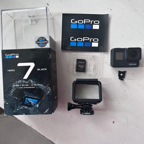 GoPro Hero7 Black actionkamera musta. Kamerassa on etunäyttö ja takana kosketusnäyttö asetusten säätöön ja kuvien esikatseluun. Laite tallentaa videota jopa 1080p 60 fps -tarkkuudella. Mukana useita kiinnikkeitä ja tarvikkeita, kuten erilaisia jalustoja, pidikkeitä ja kelluva kahva, jotka soveltuvat kameran kiinnittämiseen eri pintoihin ja käyttötarkoituksiin esimerkiksi urheilussa ja ulkoilussa. Mukana myös kolme akkua sekä kaksipaikkainen laturi.