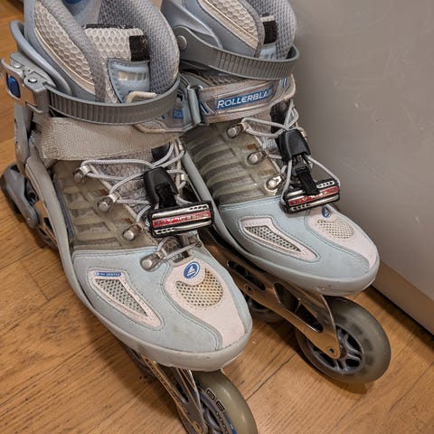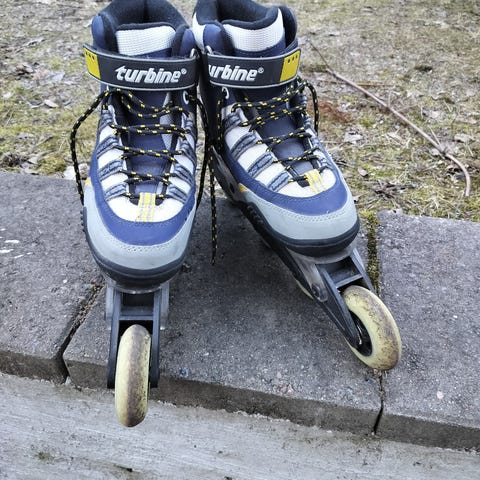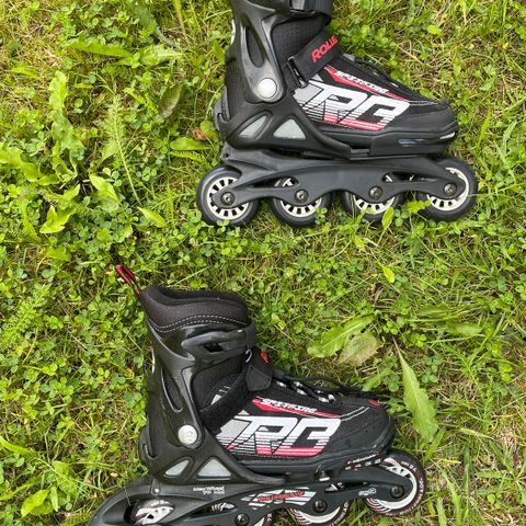 Bauer rullaluistimet, koko 4R (noin EU 36–37). Väri musta harmailla ja valkoisilla yksityiskohdilla. Kengässä nauhakiinnitys ja korkea varsi, joka tukee nilkkaa. Alustassa neljä rullaa per jalka suorassa rivissä. Soveltuvat esimerkiksi nuorelle tai pienijalkaiselle aikuiselle rullaluisteluun tai rullahockeyyn kovalla alustalla.