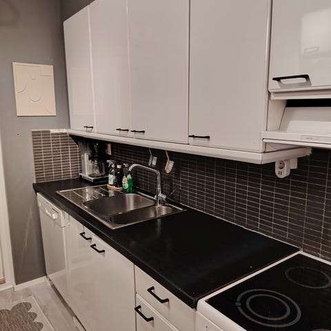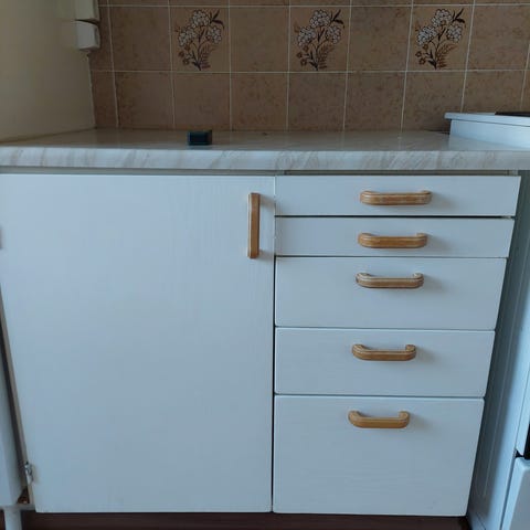 Harmaaksi maalattu keittiökaapisto, johon kuuluu ylä- ja alakaappeja, 1.5 kertainan tiskiallas. Lisäksi laatikostoja ja avolokerikkoja. Osa kaapin sisältä maalattu valkoiseksi. Kaapinovissa metalliset lankaetimet. Valkoista tasoa syvyys 60 cm, löytyy yhtenäisenä 280 cm+ pienet palat 200cm, 60 cm ja 40 cm. Alakaapiston syvyys 58 cm. esim. Mökille keittiöön tai kodinhoitotilaan. Ovet on maalattu Julan maalilla. Hana ollut käyössä 3 vuotta. Kaikki yhteensä 290 eur. Erikseen Hana 140 eur. Kaapisto 190 eur (vetimien hinnalla). Jääkaappipakastin annetaan.