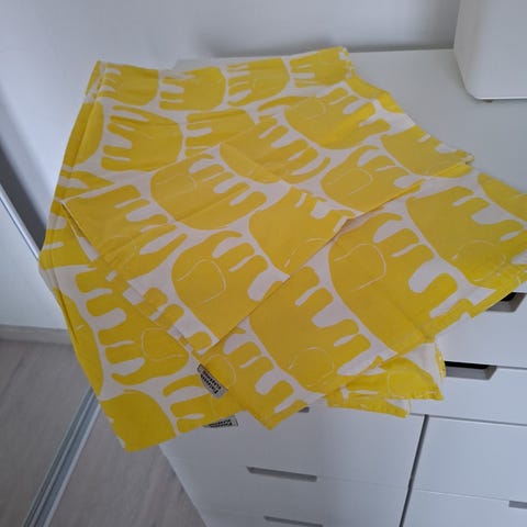 Finlayson keltainen kissa kuosinen junior koon (110x150cm) pussilakana ja tyynyliina. Todella siisti kuntoinen setti.