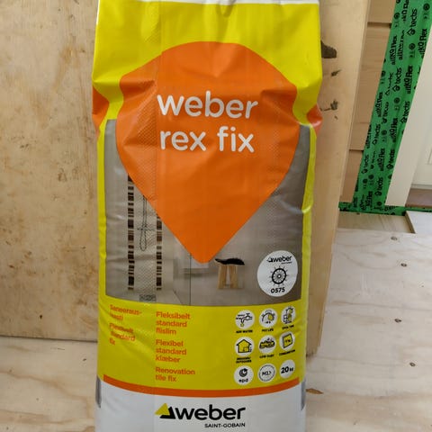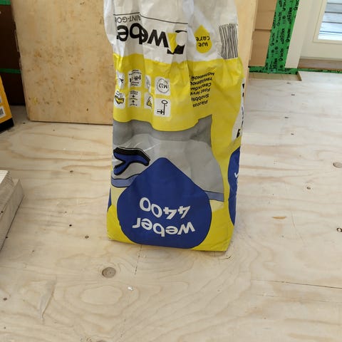 Ylimääräiseksi jäänyt täysi säkki Weber LR+ tasoitetta. Kuivalaasti seinä- ja kattopintojen tasoitukseen sisätiloissa.