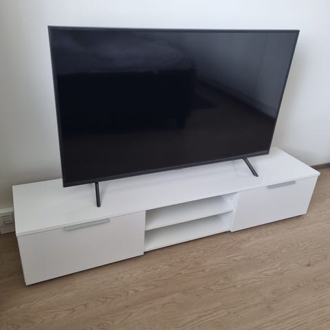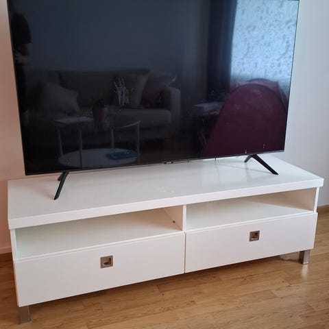 Stemmasta ostettu kotimainen valkoinen tv-taso 'Viiva' jossa on kaksi lasihyllyillä varustettua kaappiosaa reunoilla ja kaksi vetolaatikkoa keskellä. Laatikoissa ja ovissa vaimentimet.Hyvä käytetty kunto.