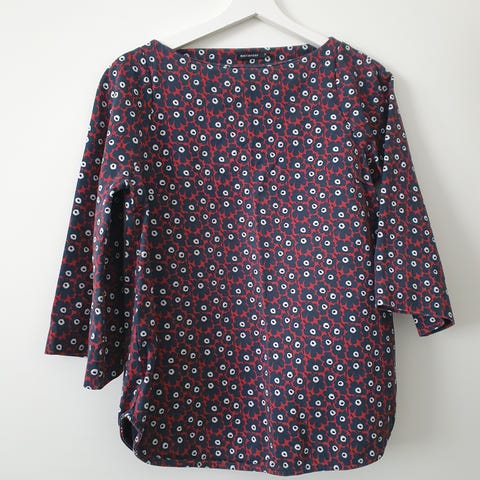 Marimekko Kioski Huimapää Unikko collari. Koko M. Materiaali puuvillaa. Pitkähihainen, pyöreä pääntie ja joustavat resorit helmassa ja hihansuissa. Uudenveroinen, kerran pesty, ei moitteita.