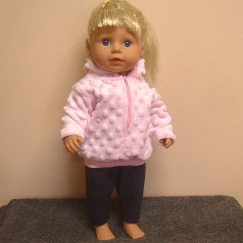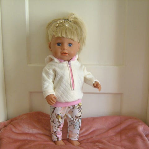 43 cm nukelle (baby born tai sister) joustocollegesta huppari, jossa edessä vetoketju. Hupun reunassa ja vyötäröllä resori. Takana orava (silityskuvio). Trikoohousuissa vyötäröllä kuminauha.