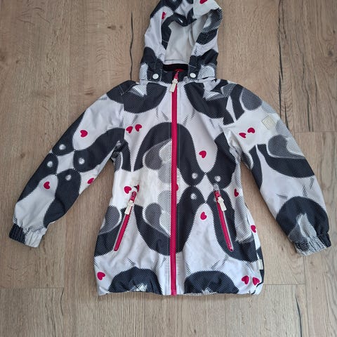 Tummansininen Reimatec vk-/kesätakki, koko 122. Materiaalina polyesteri, sisäpuolella verkkovuori. Edessä vetoketju ja joustoresori hihansuissa sekä helmassa.