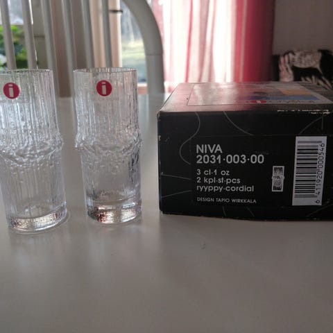 Design Tapio Wirkkala. Valmistettu v. 1972-92. Käytössä olleet, erittäin vähäisiä käytön jälkiä. Ehjät ja tosi siistit. Kork. 8,5 cm ja halk. 6,7 cm. Kahdessa lasissa kuluneet tarrat.