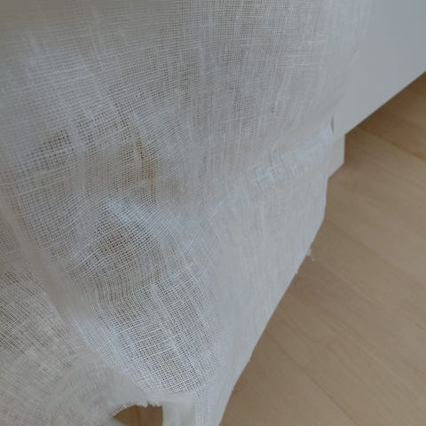 Valkoinen, ohut pellava tai pellavasekoite. Kooltaan noin 295 x 630 cm