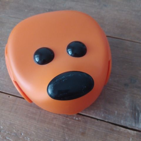 IKEA lasten eväsrasia koira-aiheinen. Oranssi muovinen rasia, jossa koiran päätä esittävä kansi, korvat toimivat sulkijoina. Sopii pienten välipalojen tai eväiden säilyttämiseen ja kuljettamiseen. Muovimateriaali on kevyt ja helppo puhdistaa käsin pesemällä.