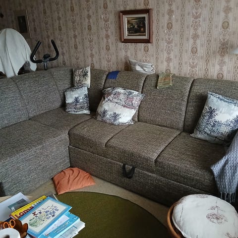 Ostettu alkujaan käytettynä, joten merkistä tai mallista ei varmuutta. Minun aikana ollut lähes käyttämättömänä. Sohva hieman nukkainen ja pieniä käytönjälkiä voi löytyä, mutta yleisilmeeltään sohva on siisti. Väri mahdollisesti hieman vaaleampi todellisuudessa.