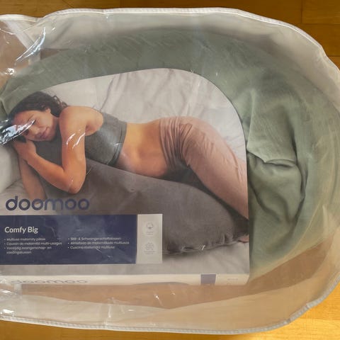Äitiys/imetystyyny kokovartalolle. Pituus 120 cm, leveys 20 cm. päästä leveämpi. Päällinen pestävissä (vetoketju). Valkoinen/mustakuvio.